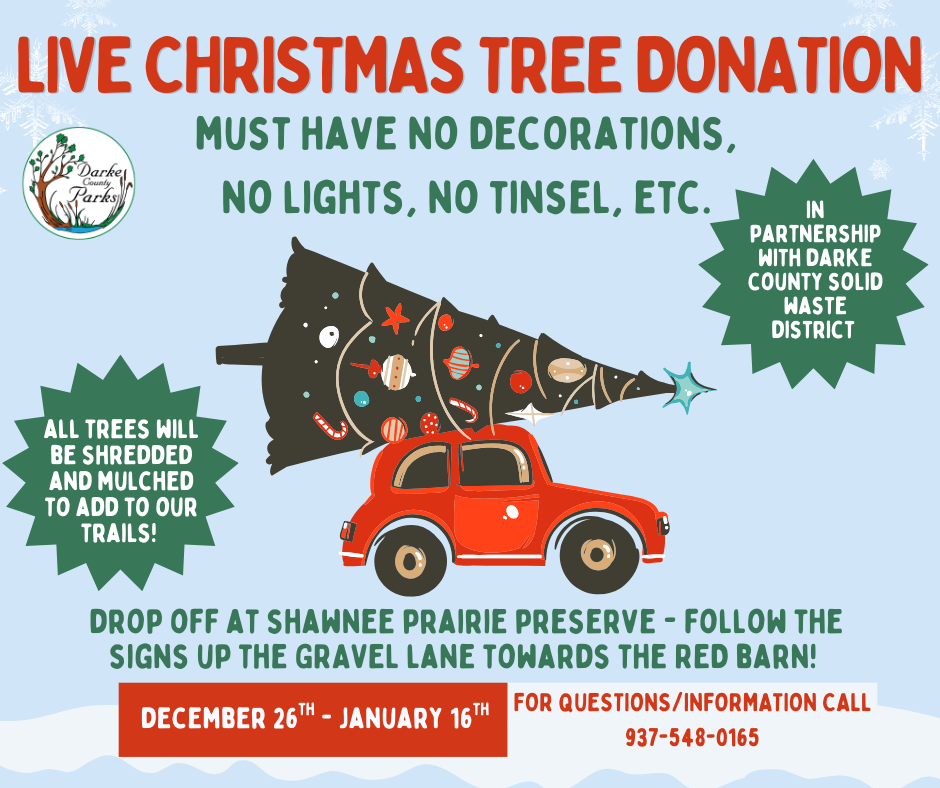 Drop off your Christmas tree at Shawnee Prairie Preserve to be made into mulch. Follow the signs up the gravel driveway towards the barn!