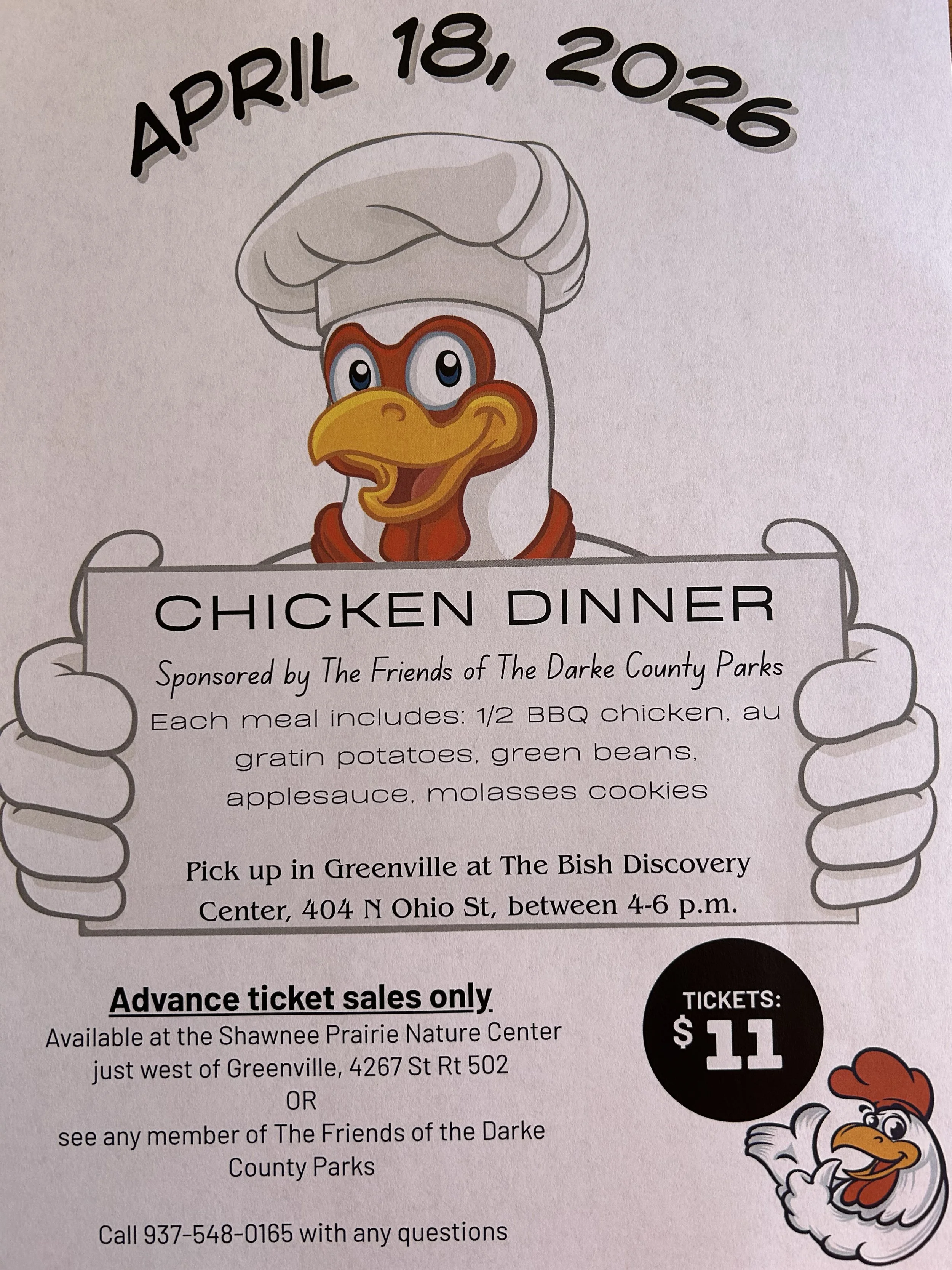 Stop into Shawnee Prairie Preserve to get your chicken dinner tickets! Sponsored by The Friends of Darke County Parks, it is take-out for a good cause. Don’t hesitate to call 937-548-0165 with any questions.